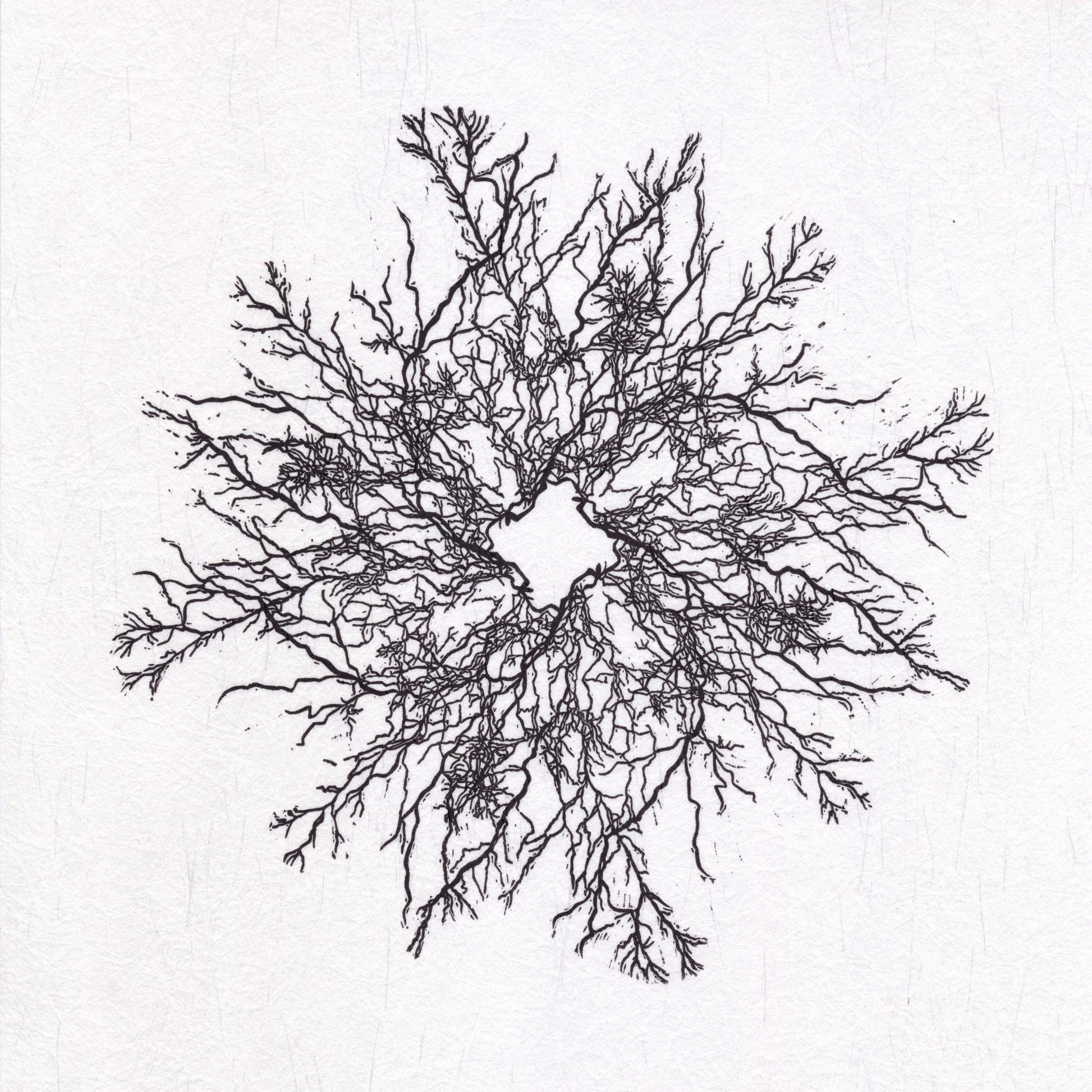 This hand-printed linocut takes inspiration from the branching form of lightning, arranged in a symmetrical pattern radiating outward from the centre of the page. The structure mimics a neural network or electrical impulse — echoing the energy and fragility found both in storm and self.