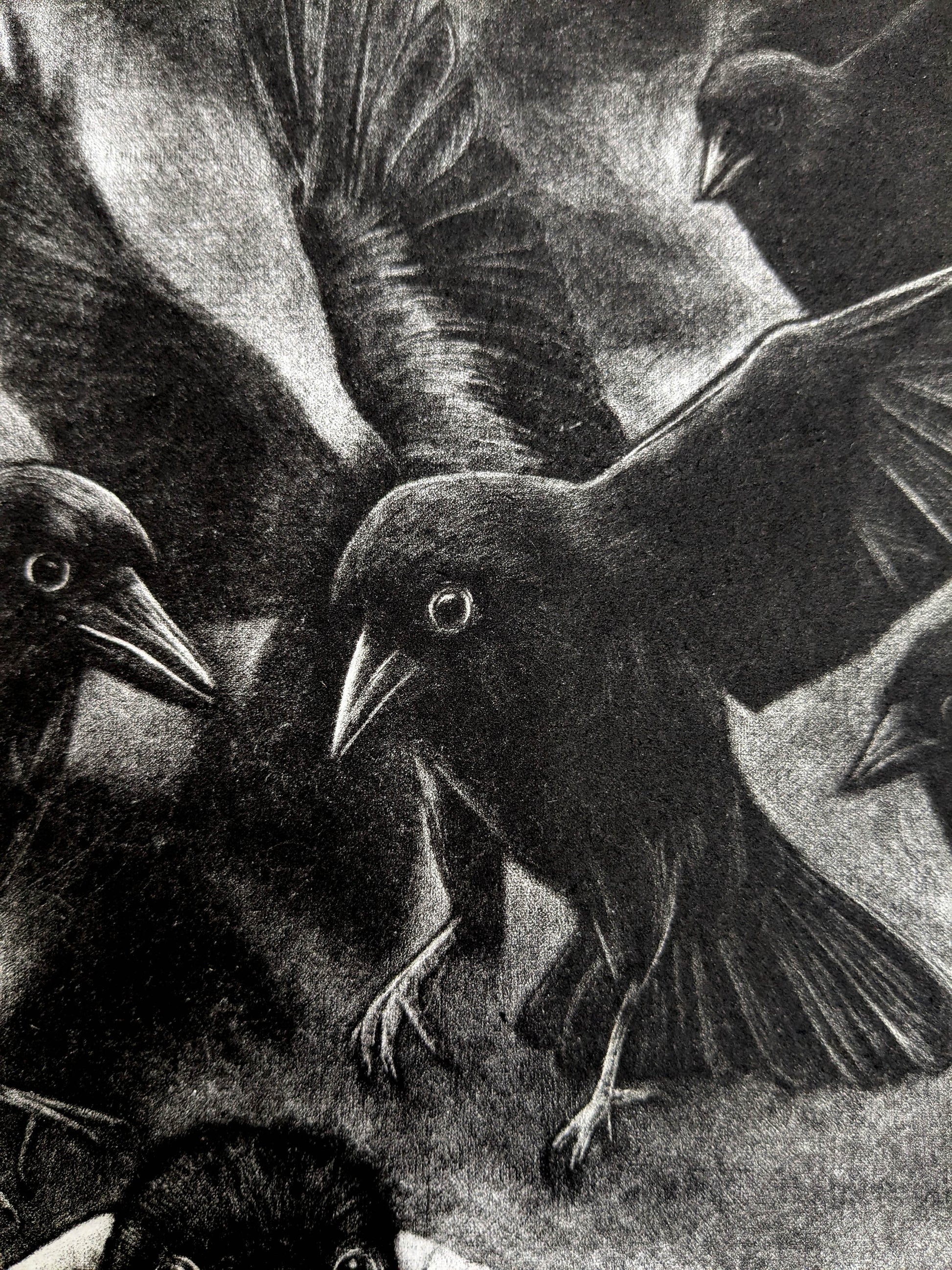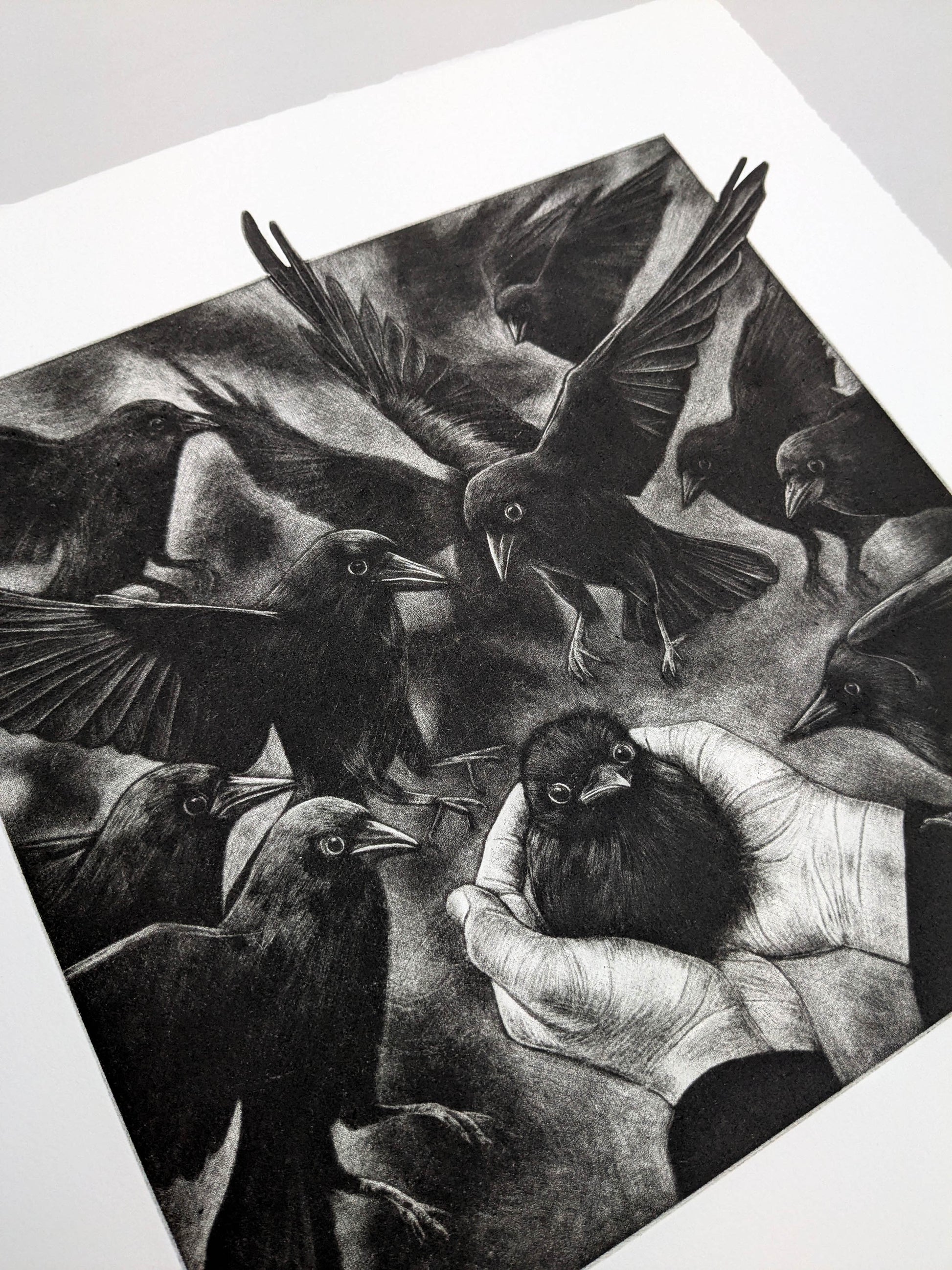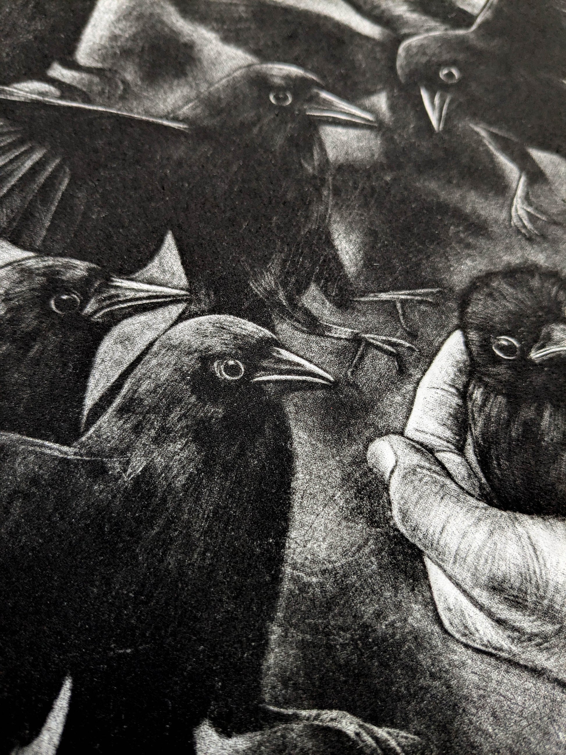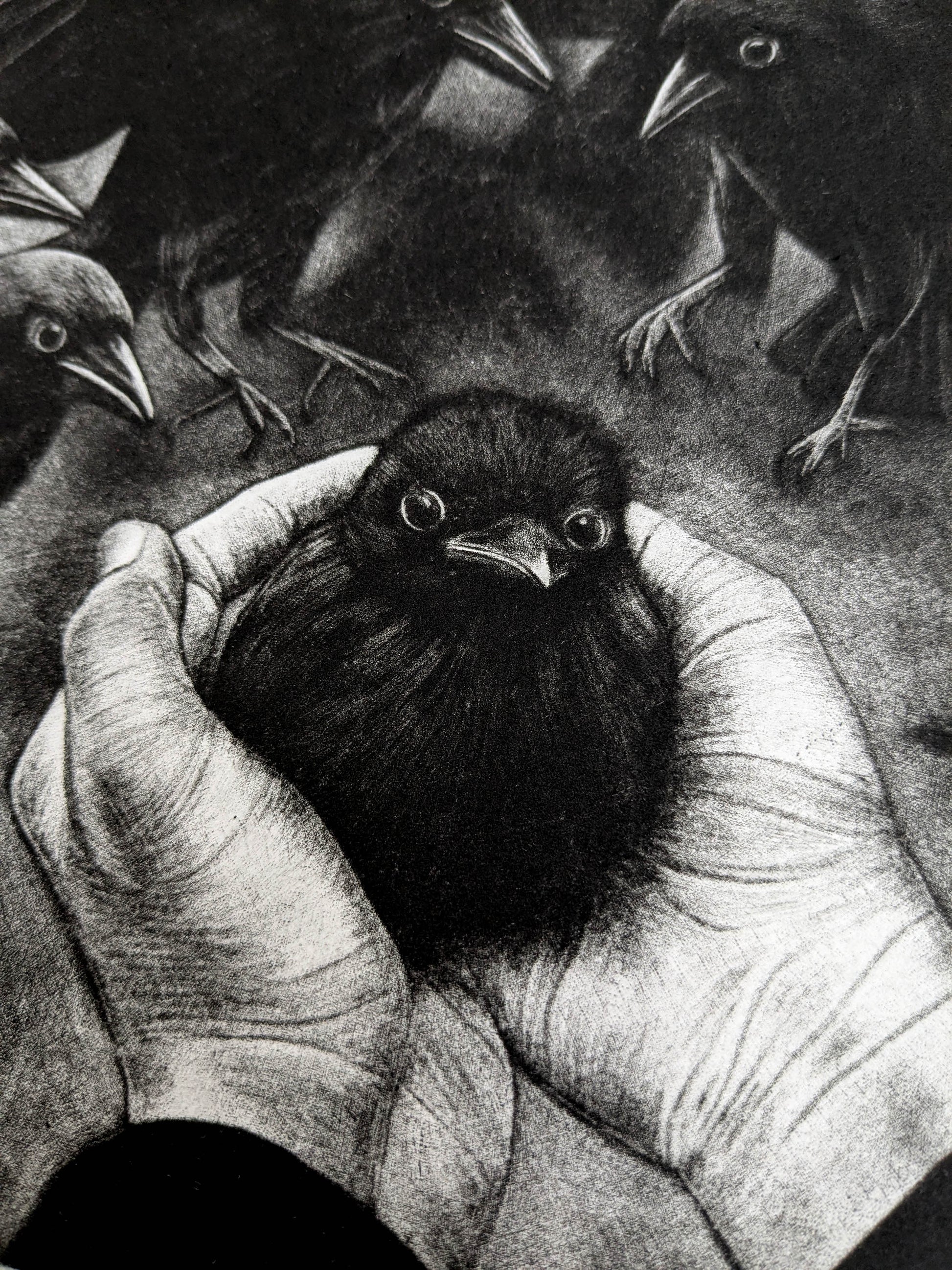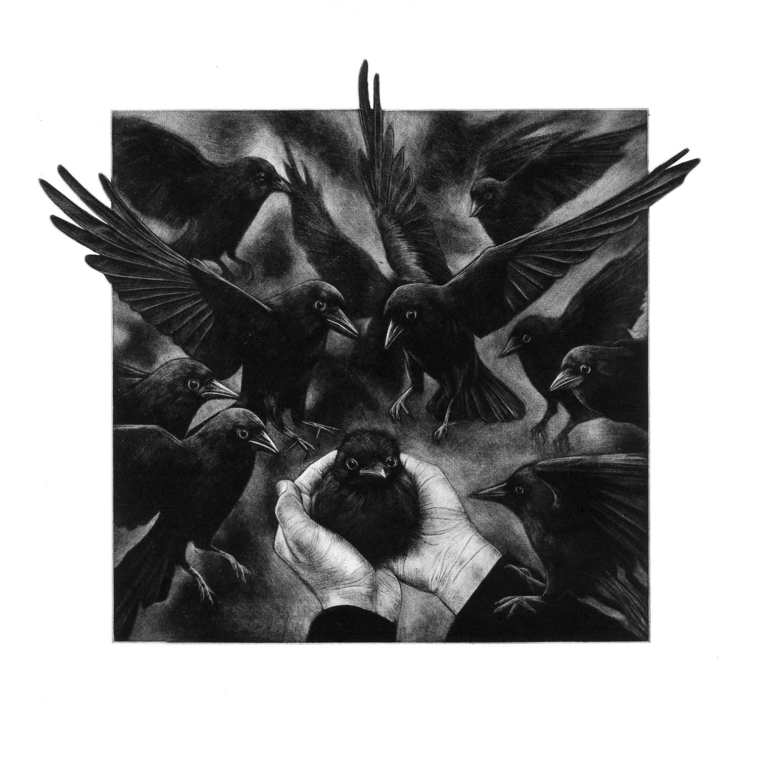 This work reflects on our uneasy relationship with the natural world. Our desire to nurture and to save, and the hubris that can accompany it. The ravens’ gaze mirrors our own, questioning where the boundaries lie between guardianship and interference, empathy and ownership. In the delicate light of the mezzotint, that uncertainty is left unresolved, inviting us to consider what it really means to keep something and what is lost in the act of keeping.