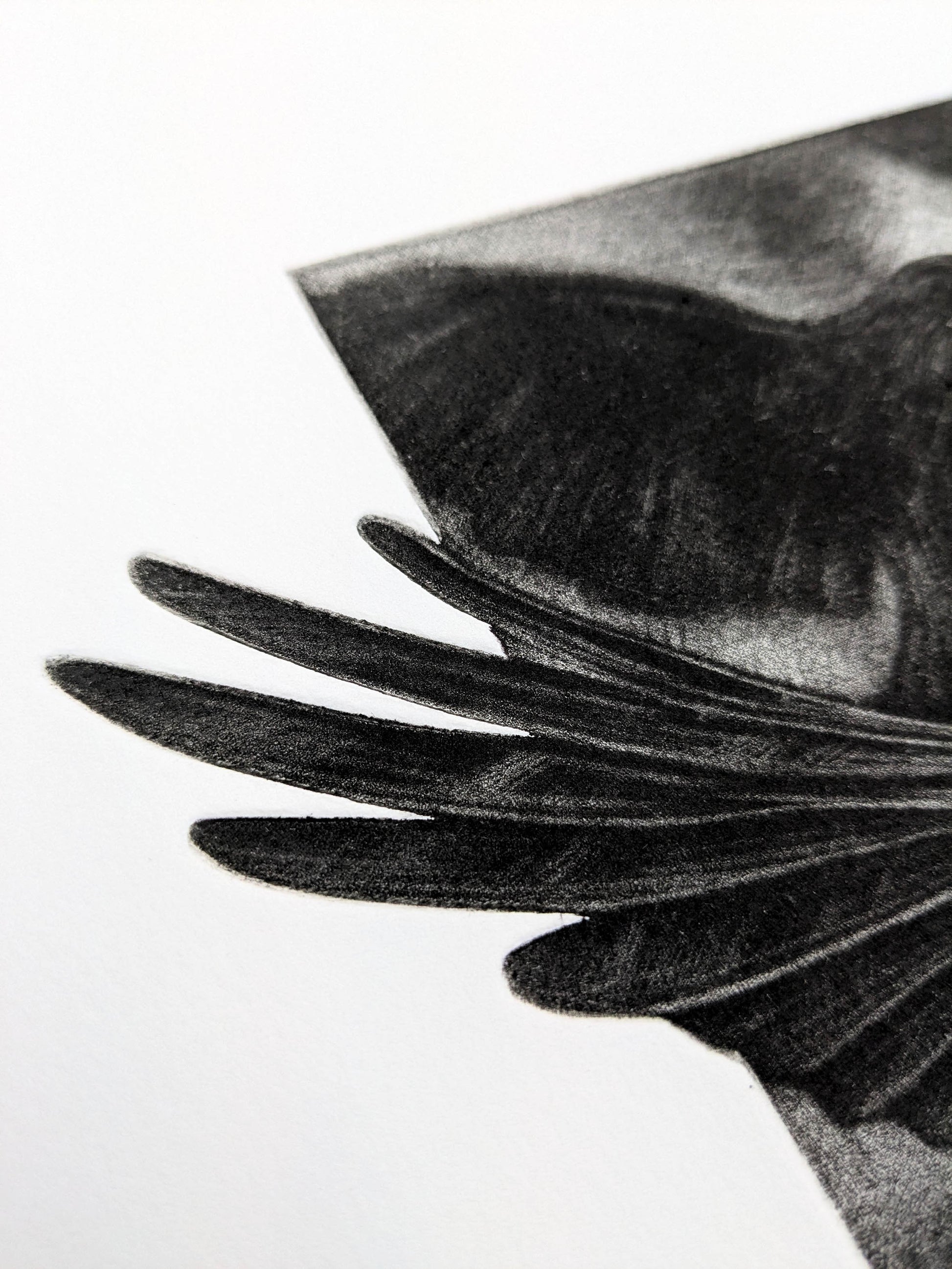 In Their Keeping is an original mezzotint and debossing by artist Rhianna Catt. The plate itself is so the wings burst from the frame, allowing the image to be debossed directly into the paper - adding subtle depth and a sculptural quality to the print.