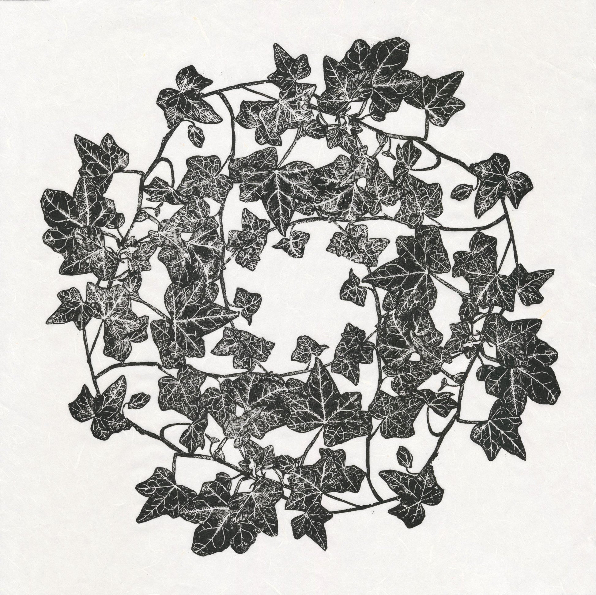 Ivy is a hand-carved and hand-printed limited edition linocut by Rhianna Catt, exploring the quiet strength and delicate intricacy of one of nature’s most enduring plants. Ivy has long symbolised resilience, connection, and growth — themes echoed in the looping circular composition of this piece.