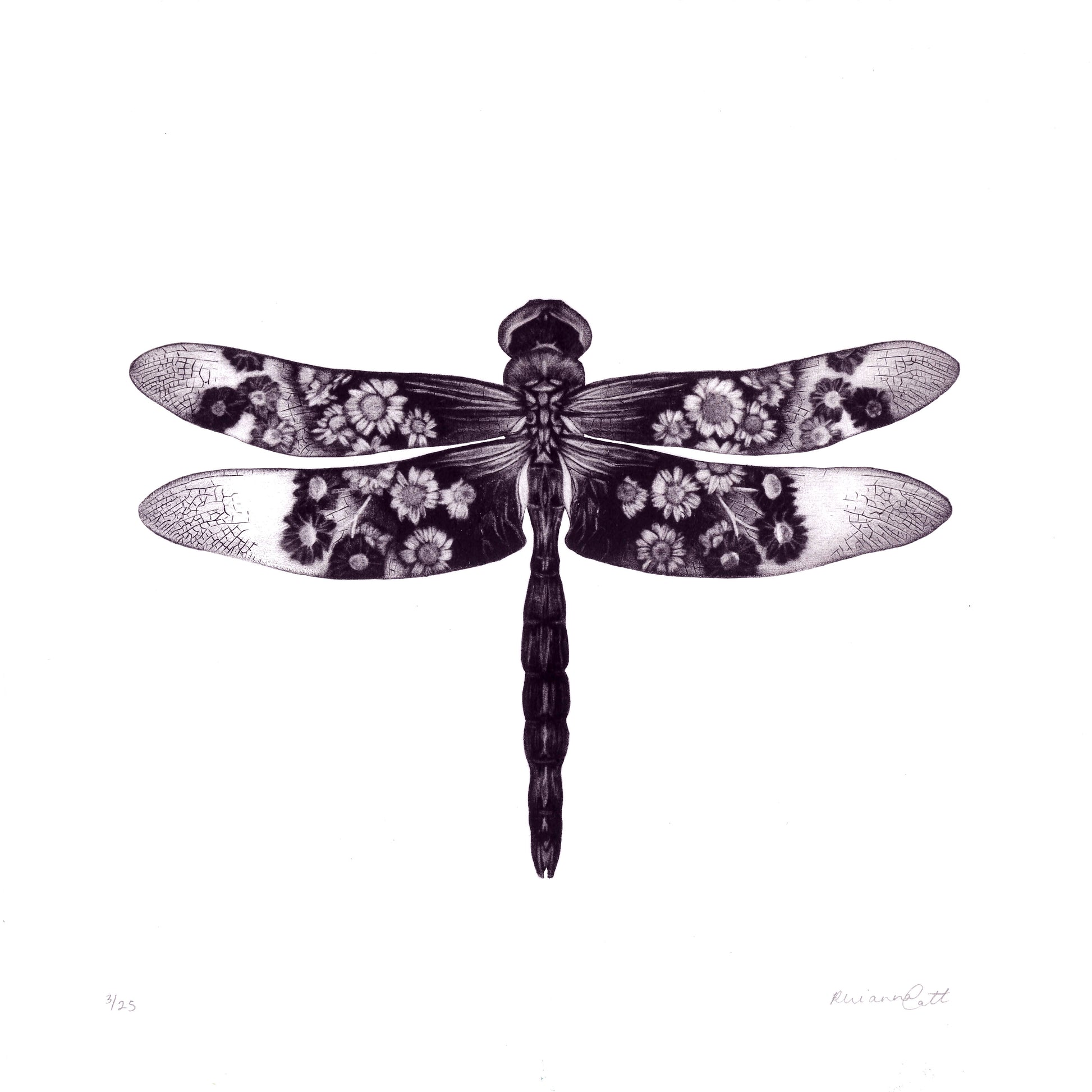 Living Veil is an original mezzotint and embossing by artist Rhianna Catt. The plate itself is cut to the shape of the Dragonfly, allowing the image to be debossed directly into the paper, adding subtle depth and a sculptural quality to the print.
