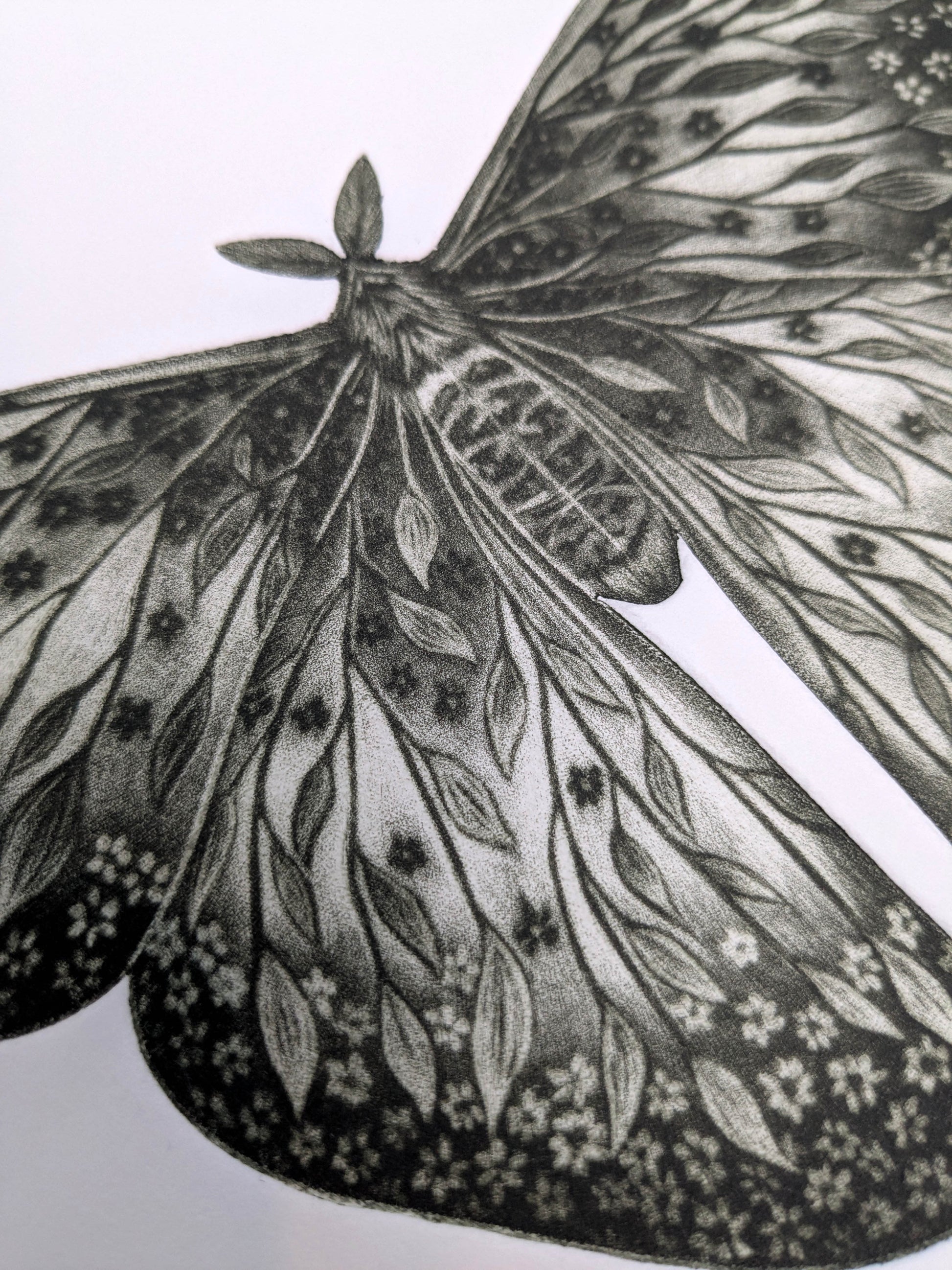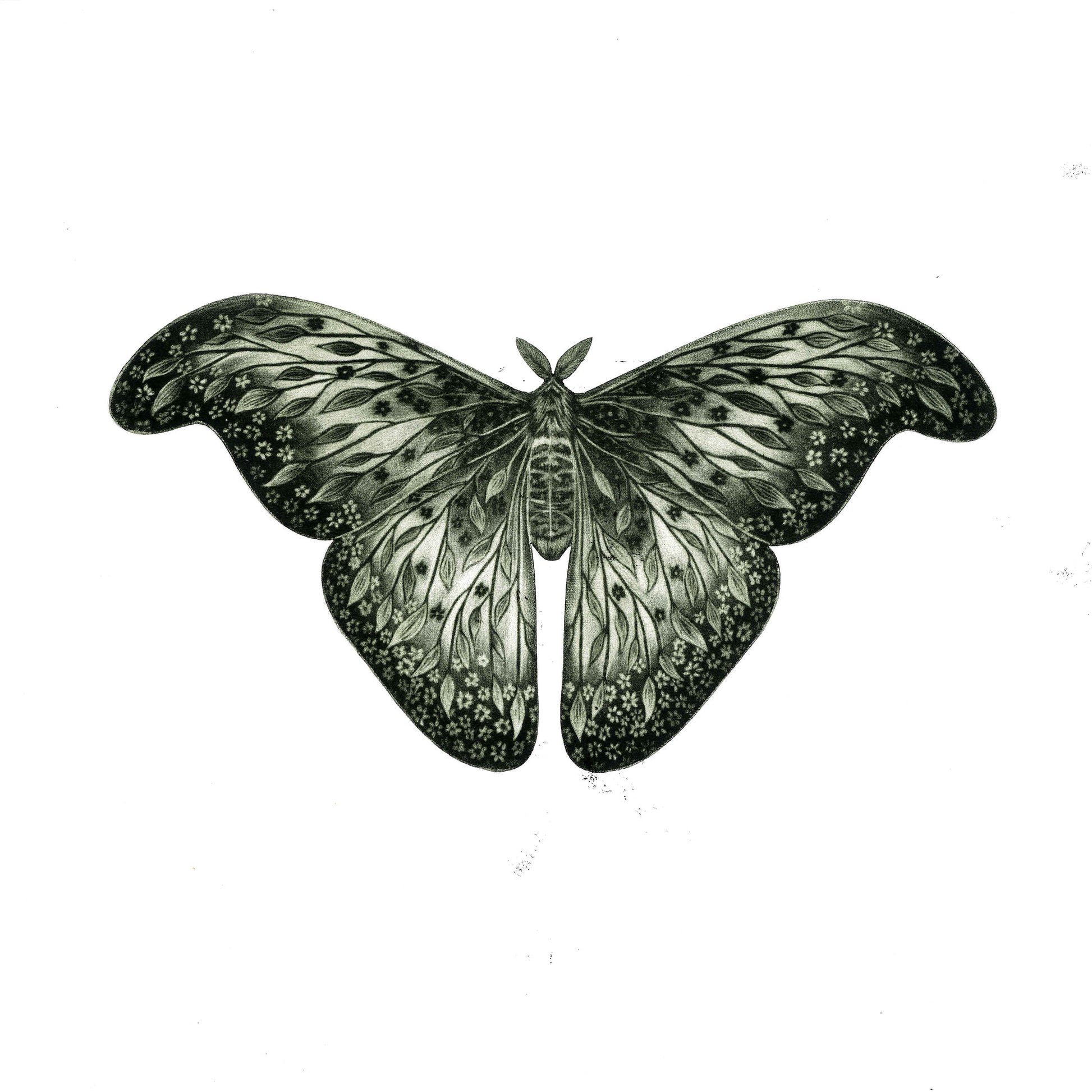 Luminous Decay is an original mezzotint and embossing by artist Rhianna Catt. The plate itself is cut to the shape of the moth, allowing the image to be debossed directly into the paper - adding subtle depth and a sculptural quality to the print.