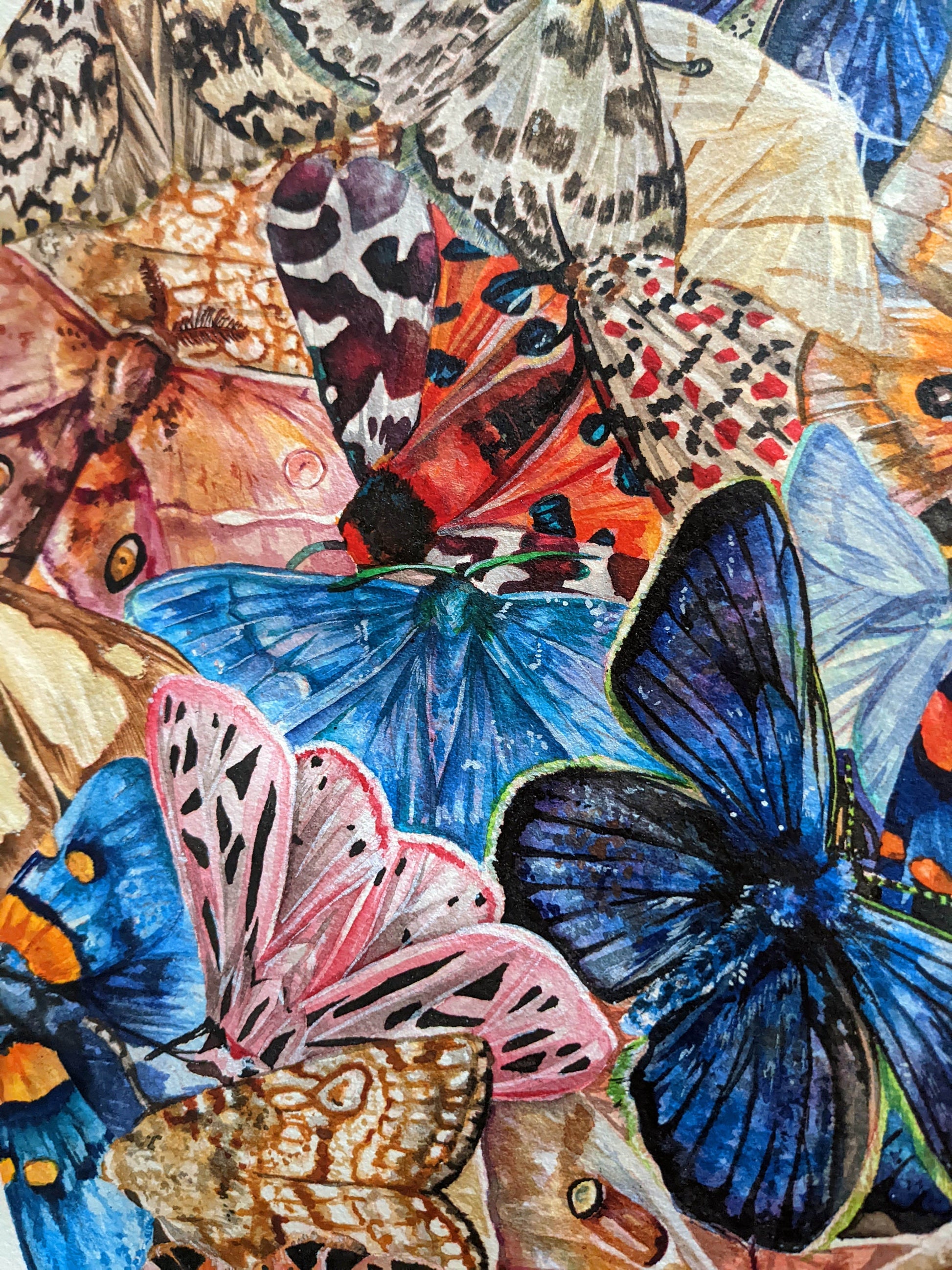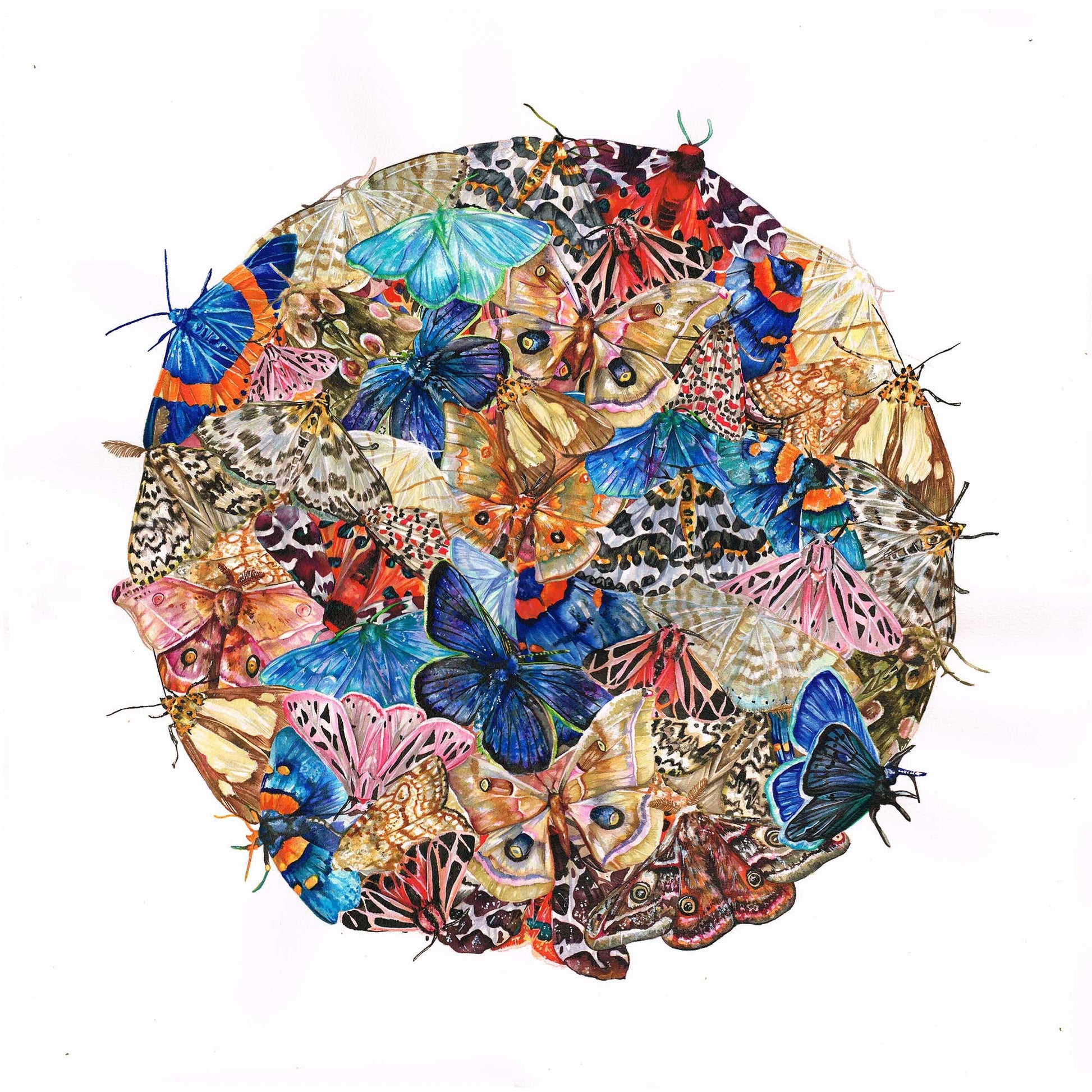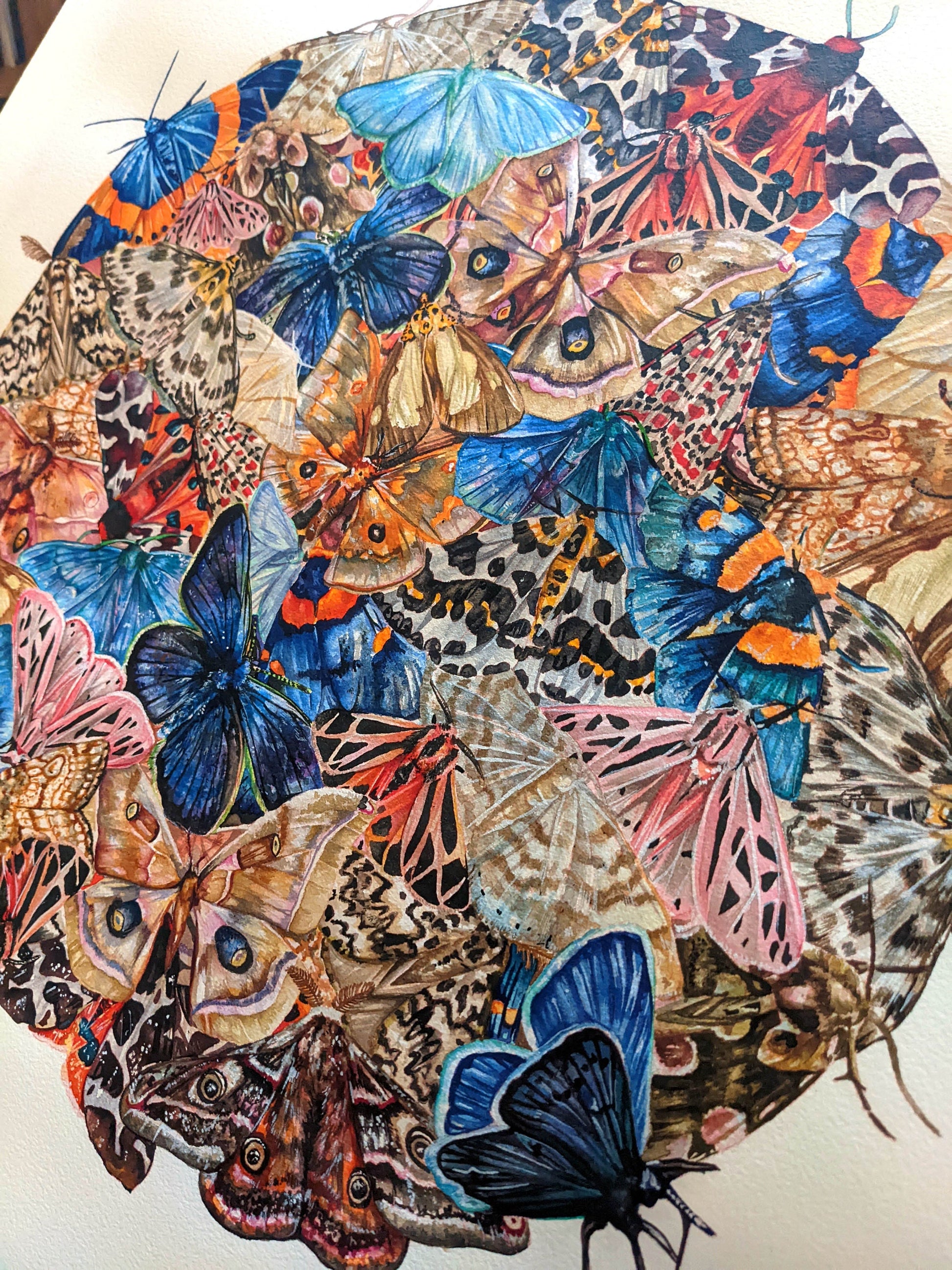The Flame is an original, large-scale acrylic ink painting by artist Rhianna Catt, created through the meticulous collage of nearly fifty individual moths. Immensely detailed and richly layered, this stunning multi-coloured piece draws viewers in, offering new discoveries with every glance.