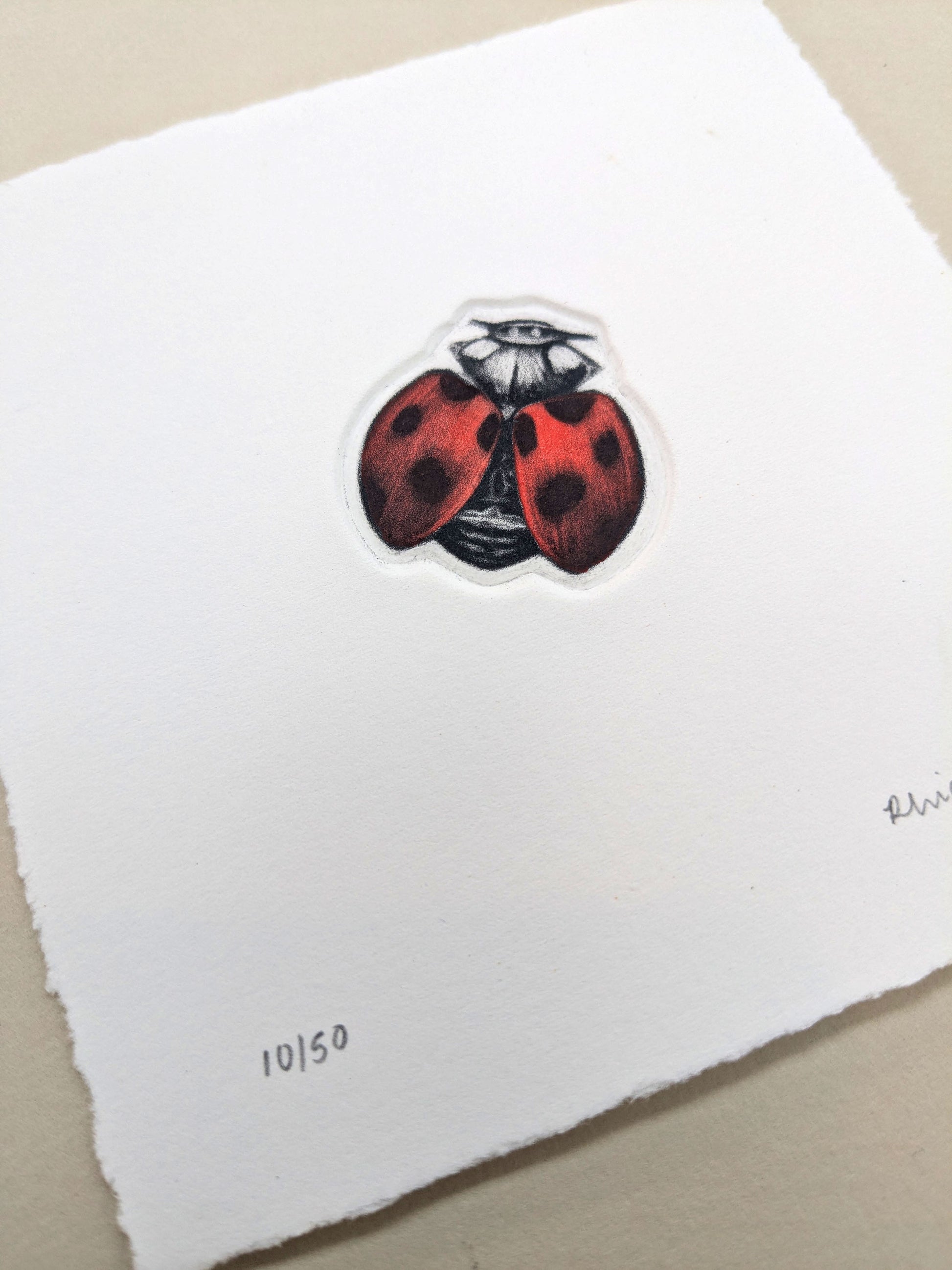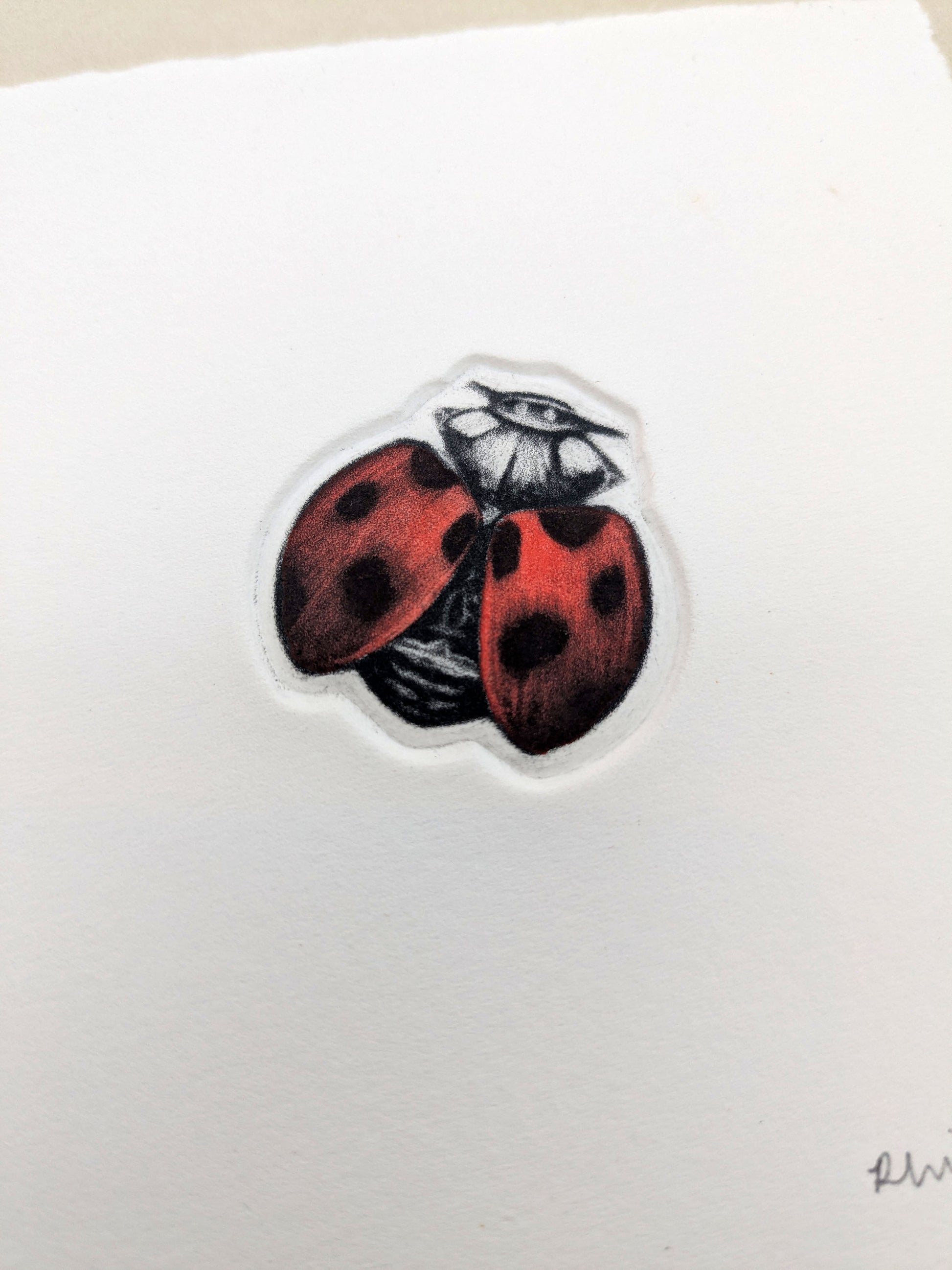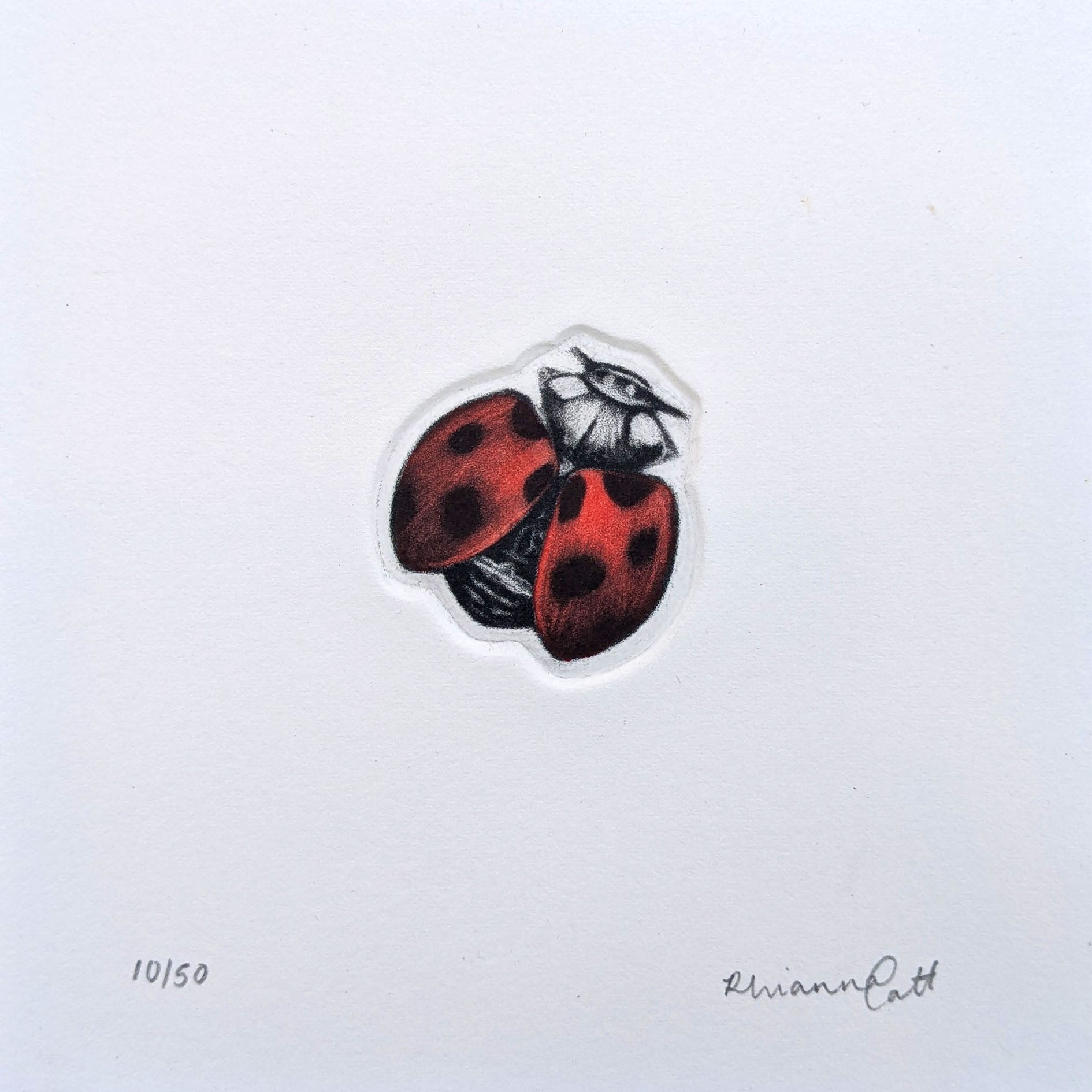 The Loveliness is an original mezzotint and embossing which is hand-finished with watercolour by artist Rhianna Catt. The plate itself is cut to the shape of the ladybird, allowing the image to be debossed directly into the paper, adding subtle depth and a sculptural quality to the print.