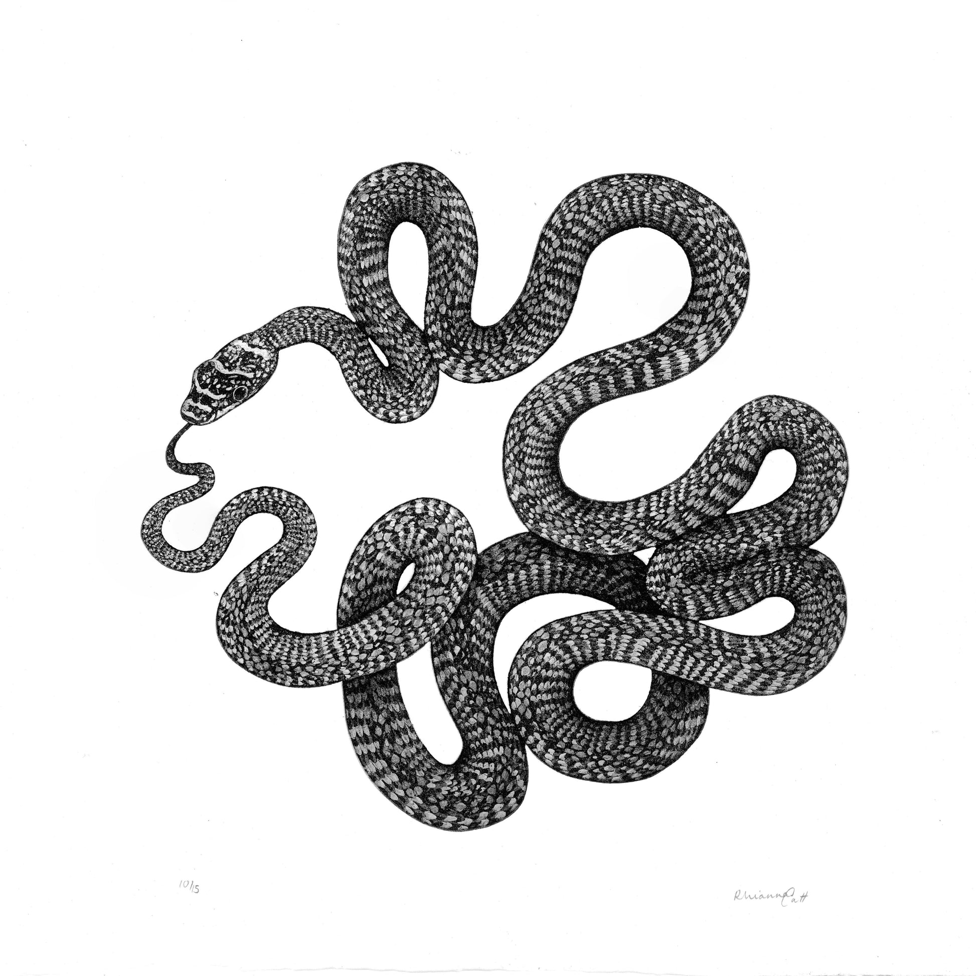 The Taste of What Was is an original etching with embossing by artist Rhianna Catt, exploring memory and rebirth. Delicately cut, the copper plate follows the contours of the snake, allowing the image to emerge not only in ink but also as a subtle embossed form pressed into the paper.