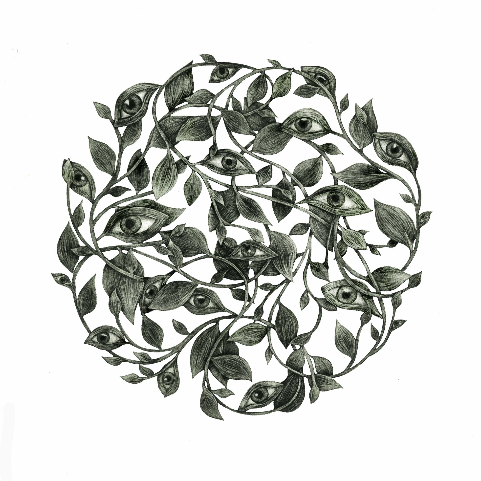 Interwoven foliage curls across the composition, with watchful eyes hidden among the leaves — evoking themes of observation, stillness, and the unseen connections we hold with the natural world. Printed in a rich, dark sage-olive green, the piece invites close, quiet attention and rewards repeated viewing.